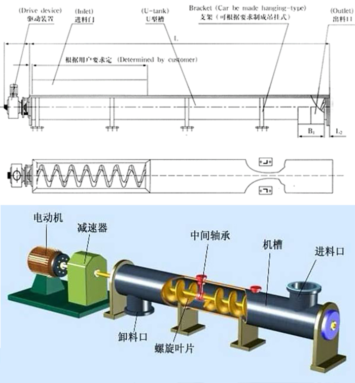 水平螺旋輸送機是將物料均勻地喂送到下道工序中,在驅動裝置中電動機帶動減速機,再由聯軸器傳遞給螺旋軸當物料從進料口進去后,在螺旋葉片的作用下將物料均勻輸出。