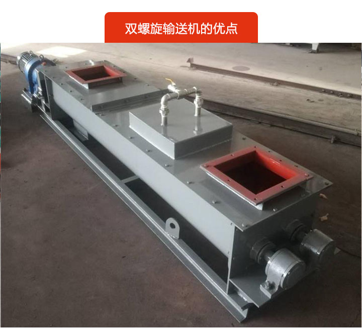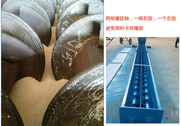 雙螺旋輸送機(jī)擁有兩根螺旋軸,旋轉(zhuǎn)方向相反(一根右旋,另一個(gè)左旋),能有效避免物料卡死螺旋,輸送中不會(huì)出現(xiàn)卡料和堵料的現(xiàn)象。