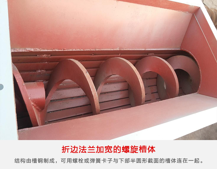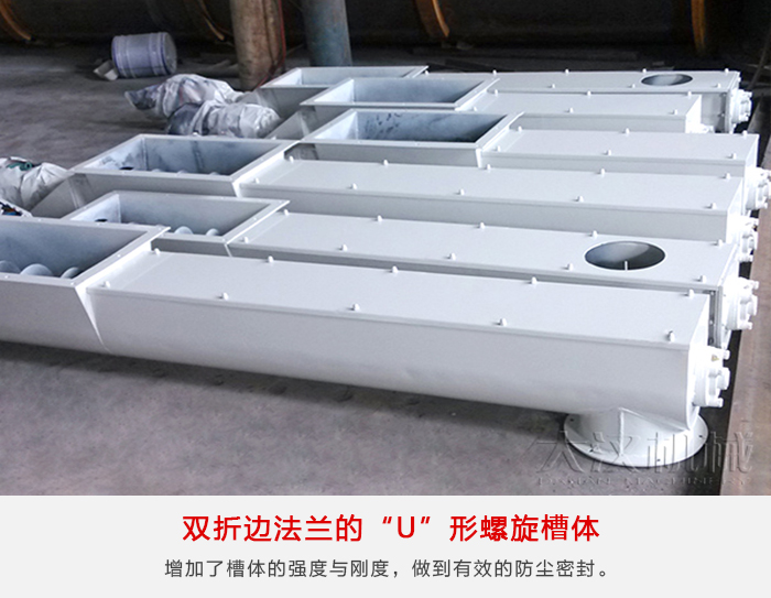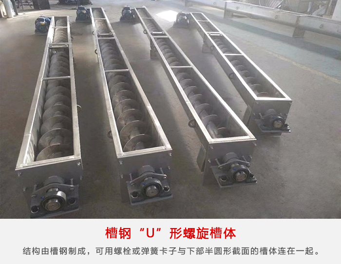 槽鋼“U”形螺旋槽體適用于輸送機支承間距要求長的場合。槽體的上邊由結(jié)構(gòu)槽鋼制成,可用螺栓或彈簧卡子與下部半圓形截面的槽體連在一起。