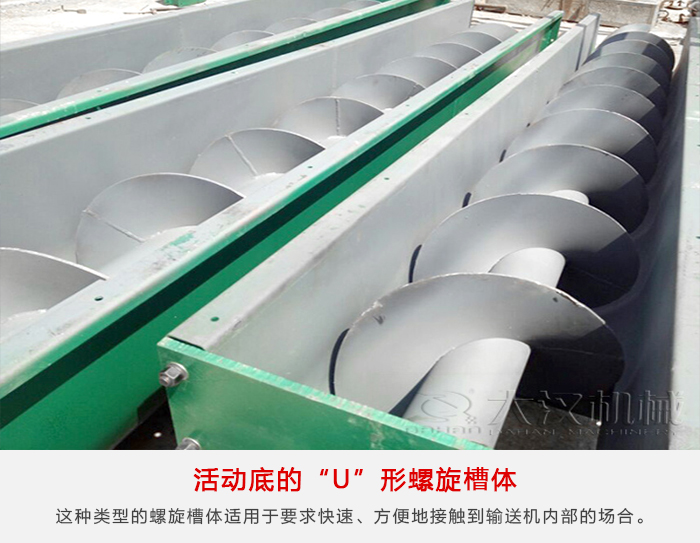這種類型的螺旋槽體適用于要求快速、方便地接觸到輸送機內(nèi)部的場合?;顒拥椎腢形螺旋槽體由上部剛性的槽鋼與下部半圓形截面槽上體所構(gòu)成,半圓形截面槽體的一邊為鉸接面,另一邊則采用彈簧卡子夾緊或其他形式能快速打開的連接裝置。