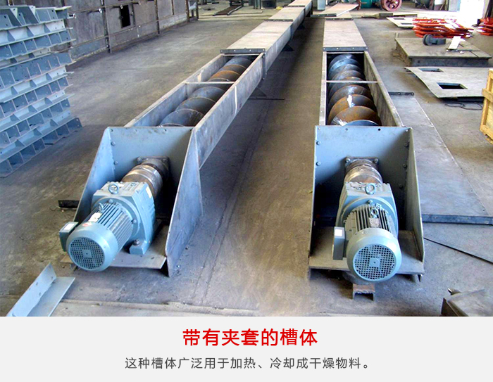 煤粉螺旋輸送機這種形式的槽體由加工好的夾套連續(xù)地焊接在普通結(jié)構(gòu)的槽體上,其上焊有換熱介質(zhì)的進出口管。這種槽體廣泛用于加熱、冷卻成干燥物料。夾套中的隔板使循環(huán)水較好地分配面強化熱交換效果。
